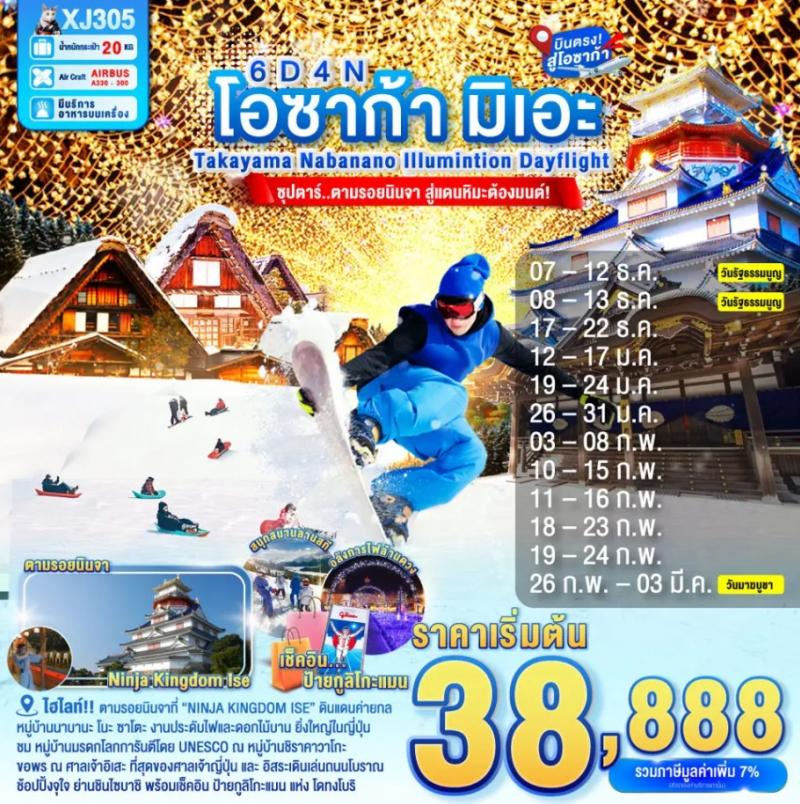 - ค่าน้ำหนักสัมภาระท่านละไม่เกิน 20 กิโลกรัม และ ค่าประกันวินาศภัยเครื่องบินตามเงื่อนไขของแต่ละสายการบินที่มีการเรียกเก็บ (สำหรับโปรแกรมที่เดินทางโดยเครื่องบิน)