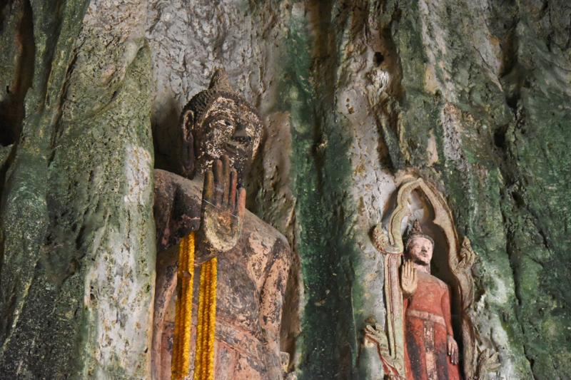 นำท่านกราบ หลวงพ่อดำ พระพุทธรูปศักดิ์สิทธิ์สมัยทวารวดี ที่อยู่คู่ชุมชนนี้มาตั้งแต่บรรพบุรุษ ประดิษฐานใน “ถ้ำรงค์” คงความเก่าแก่ยาวนานมาเกือบ 1,000 ปี อัศจรรย์ที่ฐานชุกชีจนถึงช่วงเอวขององค์พระ แกะจากผนังหินถ้ำเป็นชิ้นเดียว ตั้งแต่ช่วงเอวขึ้นไปจนถึงเศียรพระแกะจากหินทราย อยู่ในอิริยาบทท่ายืนปางห้ามญาติ ถือเป็นพระพุทธรูปศักดิ์สิทธิ์ ที่ชาวบ้านถ้ำรงค์มีความเลื่อมใสศรัทธาอย่างมาก |